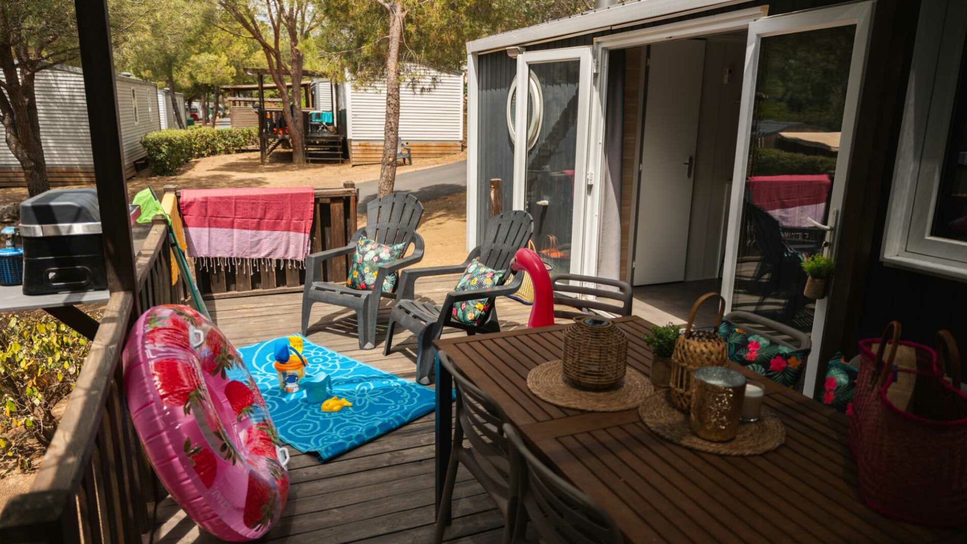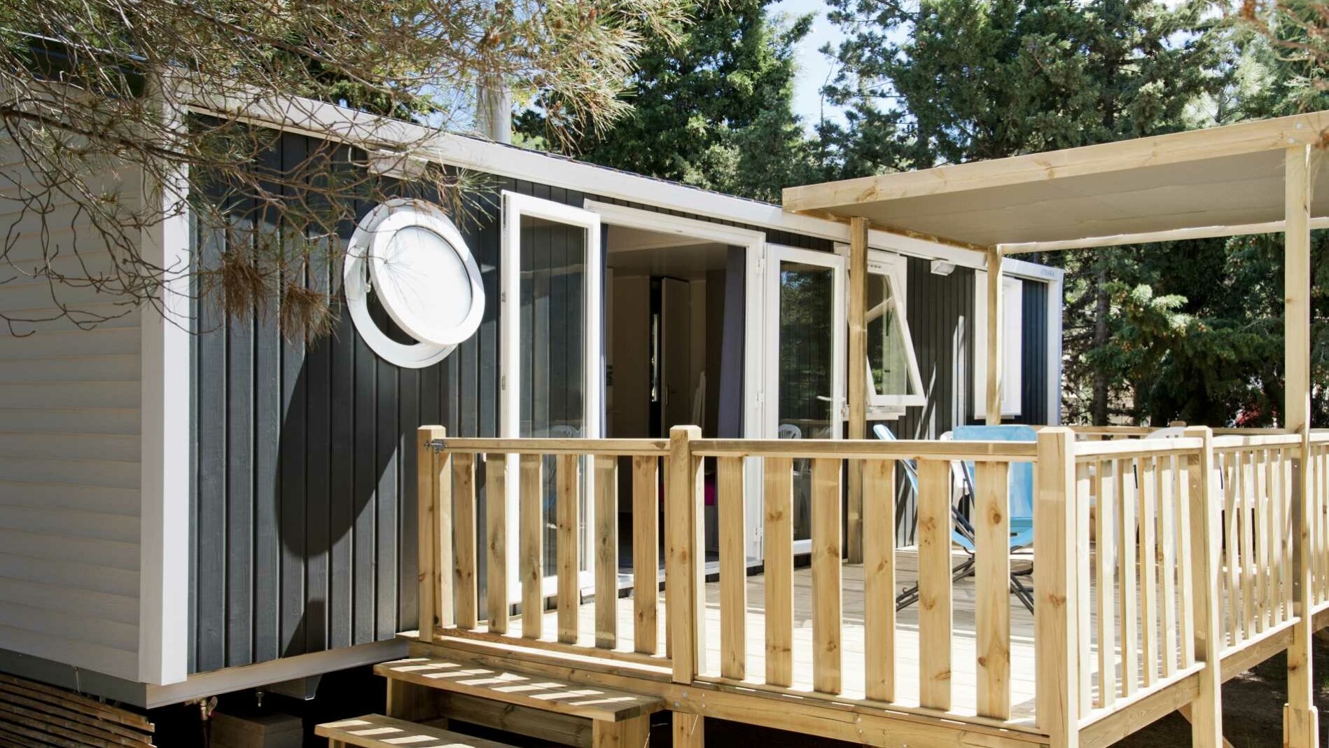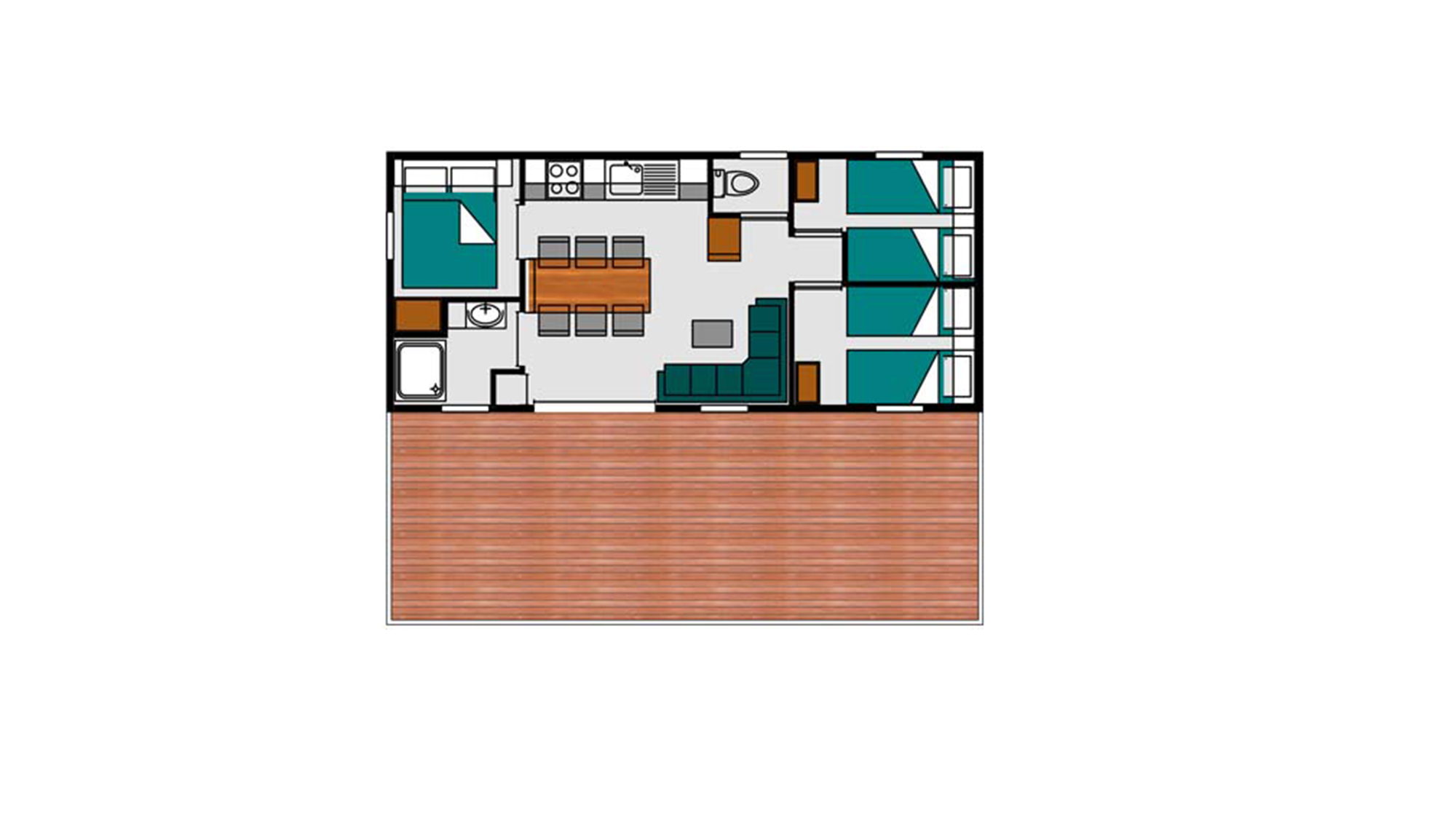 34 m² + 20 m² De terrassa coberta, un habitació con llit dobla (160 x 200), dos habitacions amb 2 llits simples (80 x 190), un racó saló, una gran cuina completament equipada amb conjunt central, sala d’aigua amb dutxa XXL (100 x 80), lavabos, vàter separat. Mobles de jardí.