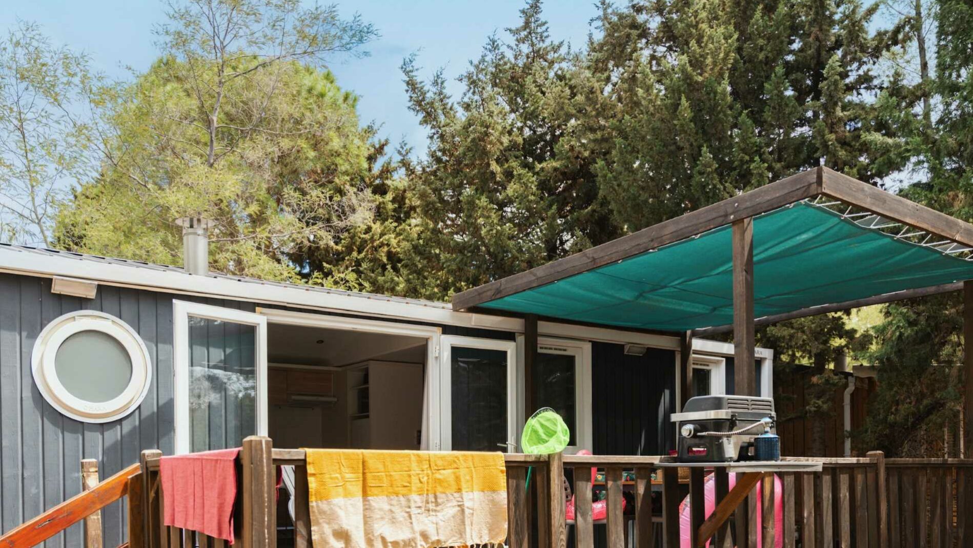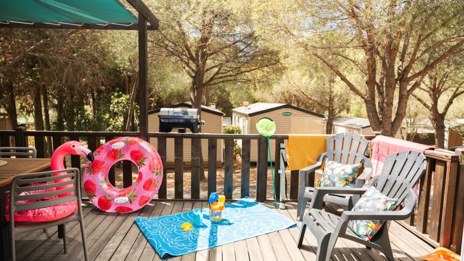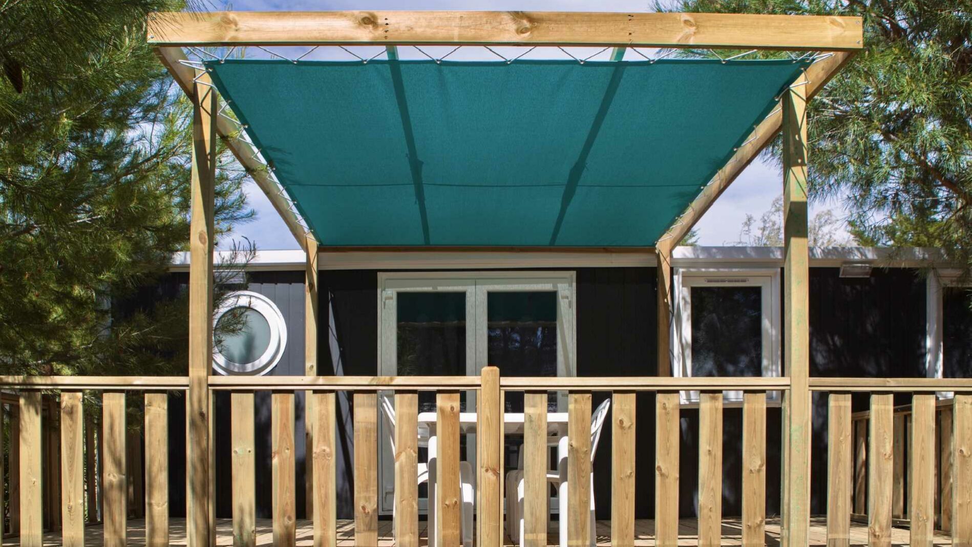 34 m² + 20 m² De terrassa coberta, un habitació con llit dobla (160 x 200), dos habitacions amb 2 llits simples (80 x 190), un racó saló, una gran cuina completament equipada amb conjunt central, sala d’aigua amb dutxa XXL (100 x 80), lavabos, vàter separat. Mobles de jardí.