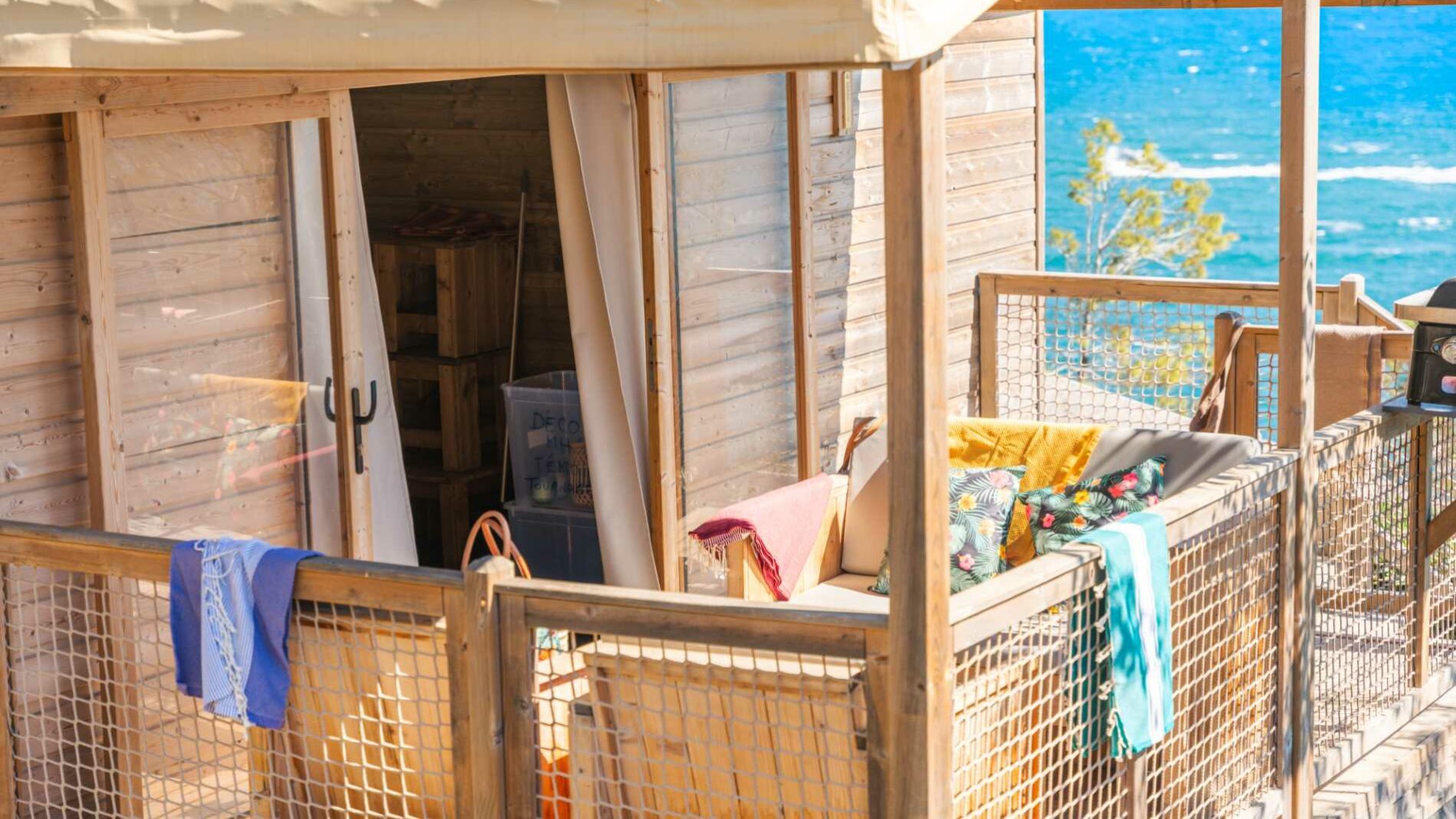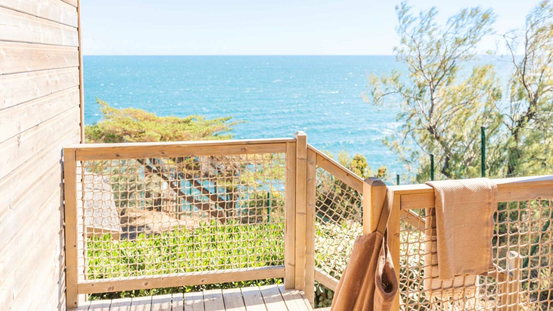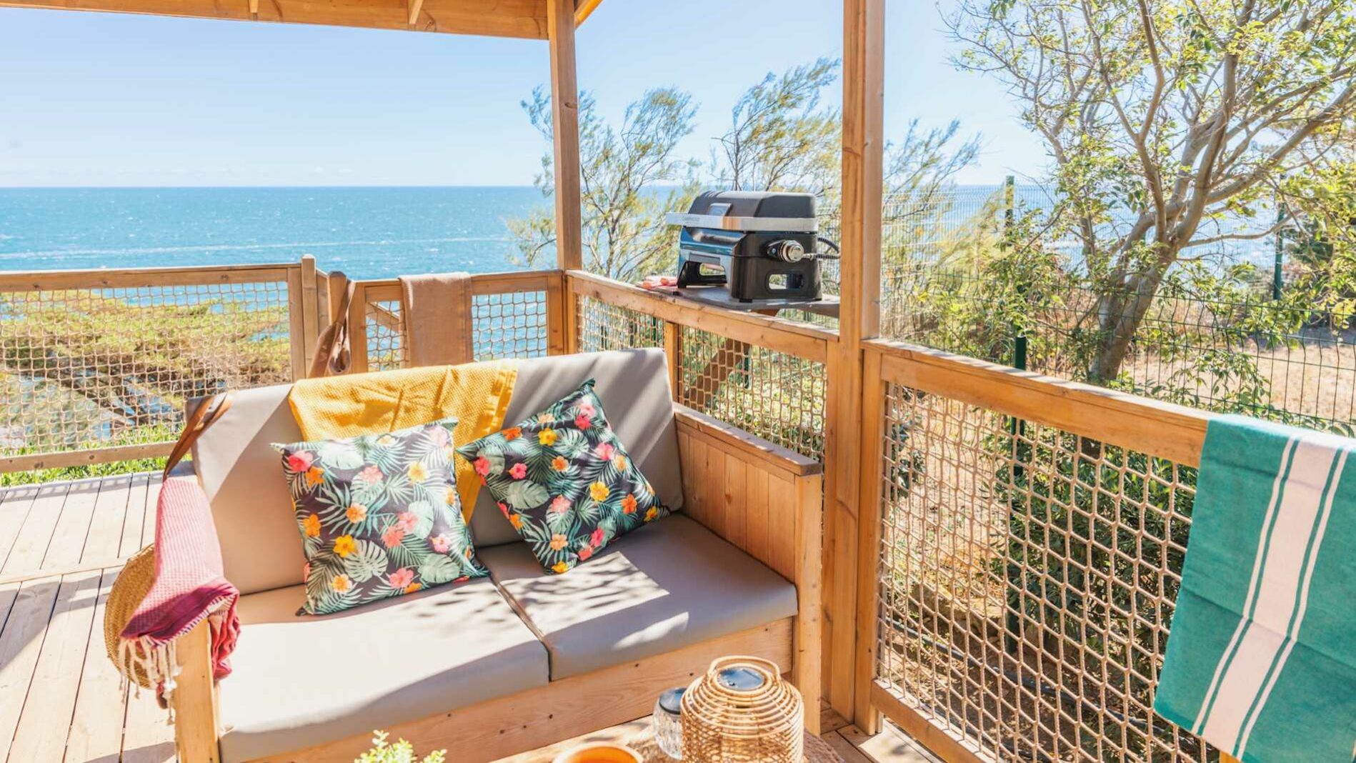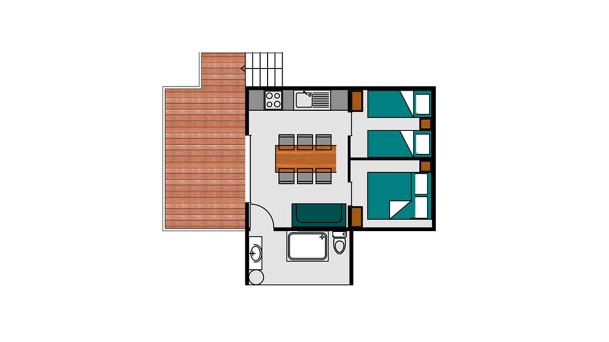 27 m² + 10 m² De terrassa coberta, una cambra amb 1 llit doble (140×190), una cambra amb 2 llits simples (80×190), un racó saló amb un sofà convertible per 2 persones (140×190). Una cuina equipada. Una sala de bany amb lavabos, dutxa i WC. Mobles de jardí de fusta.