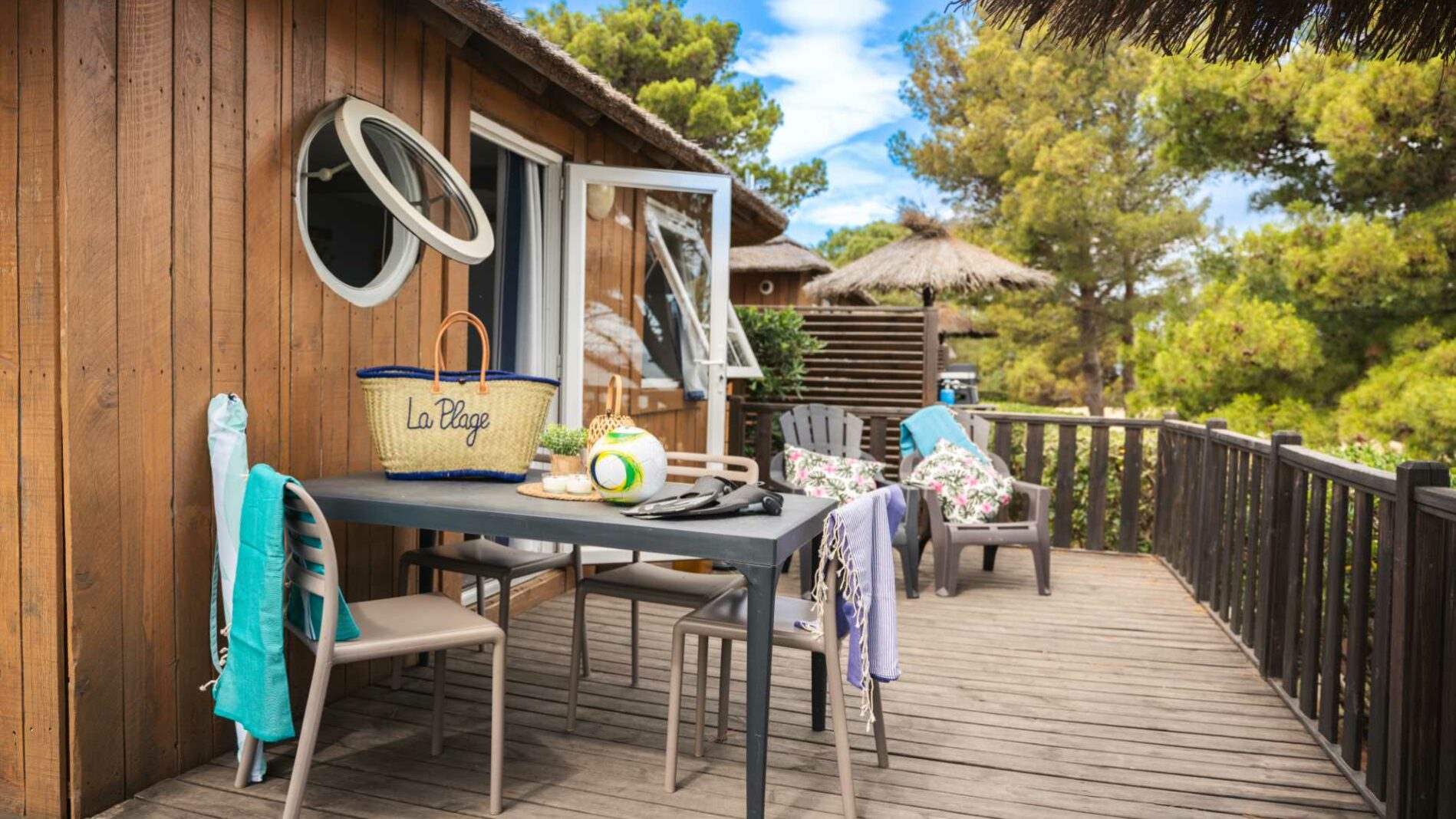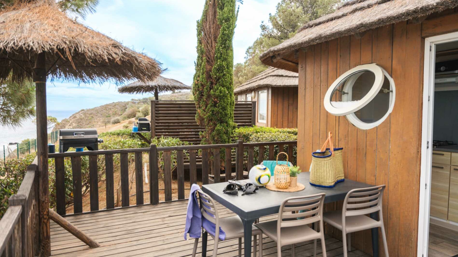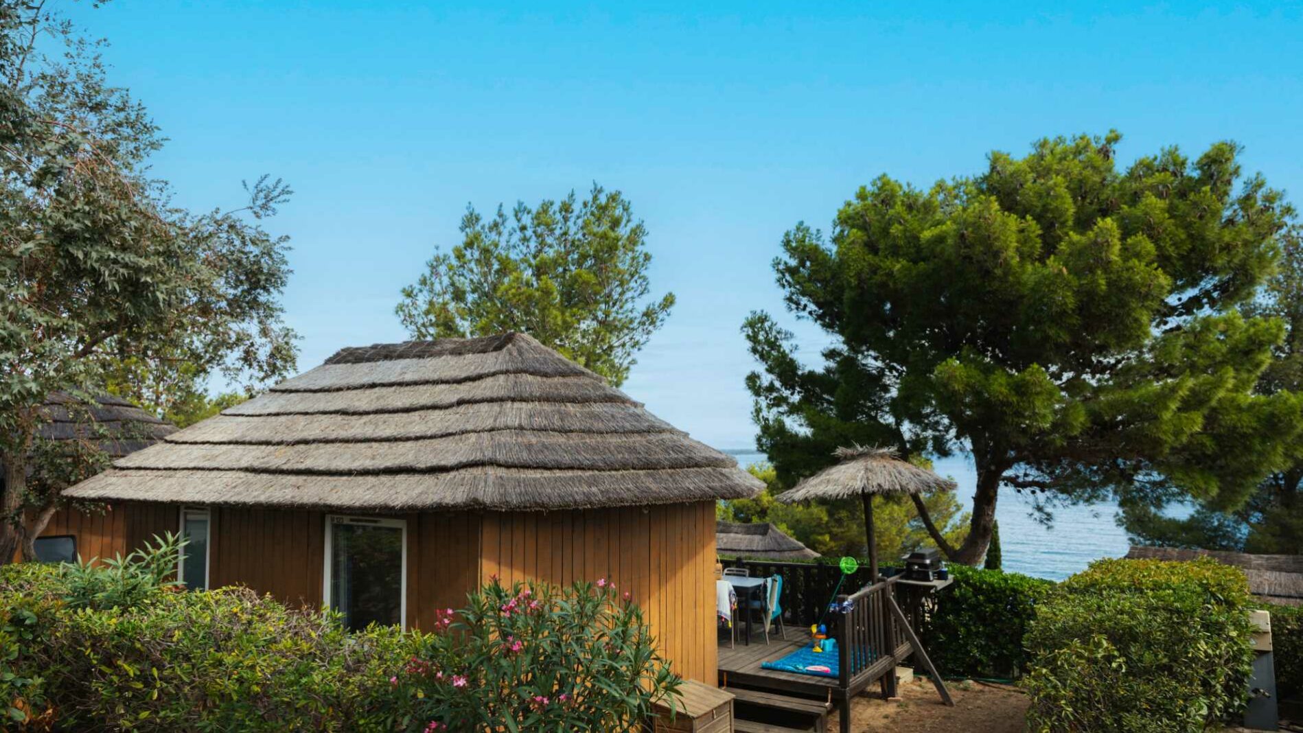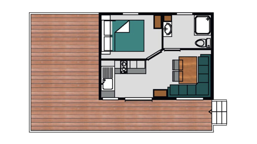 La comoditat d’un mobile home renovat en cabana de 20 m². Una gran habitació equipada d’un llit (160 x 200). Un saló amb banqueta en forma de L equipada amb un llit calaix (140 x 190). Una cuina equipada. Una sala de bany amb lavabos, dutxa i WC. Una terrassa alta, de fusta, variant de 15 a 22 m² segons l’espai exterior disponible atès que tots els nostres Faré. Mobles de jardí amb un para-sol fix en bruc.
