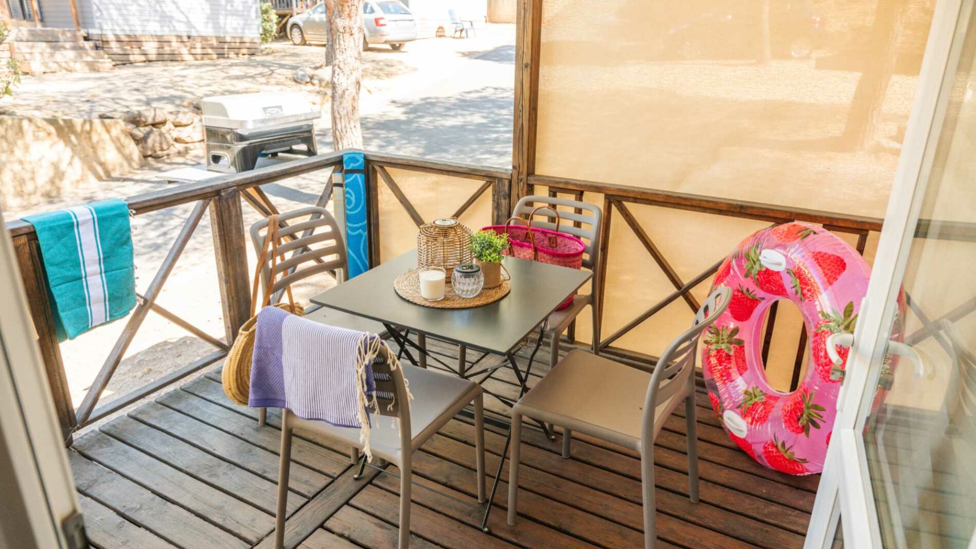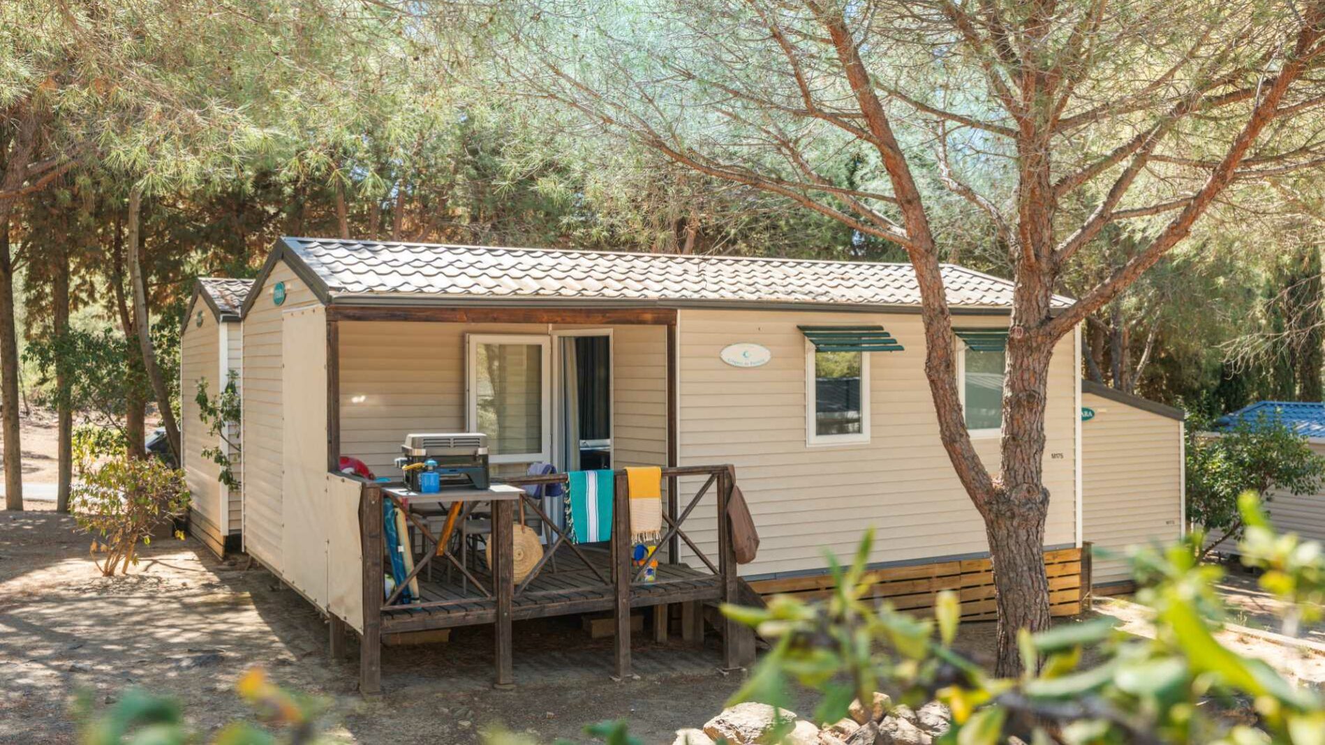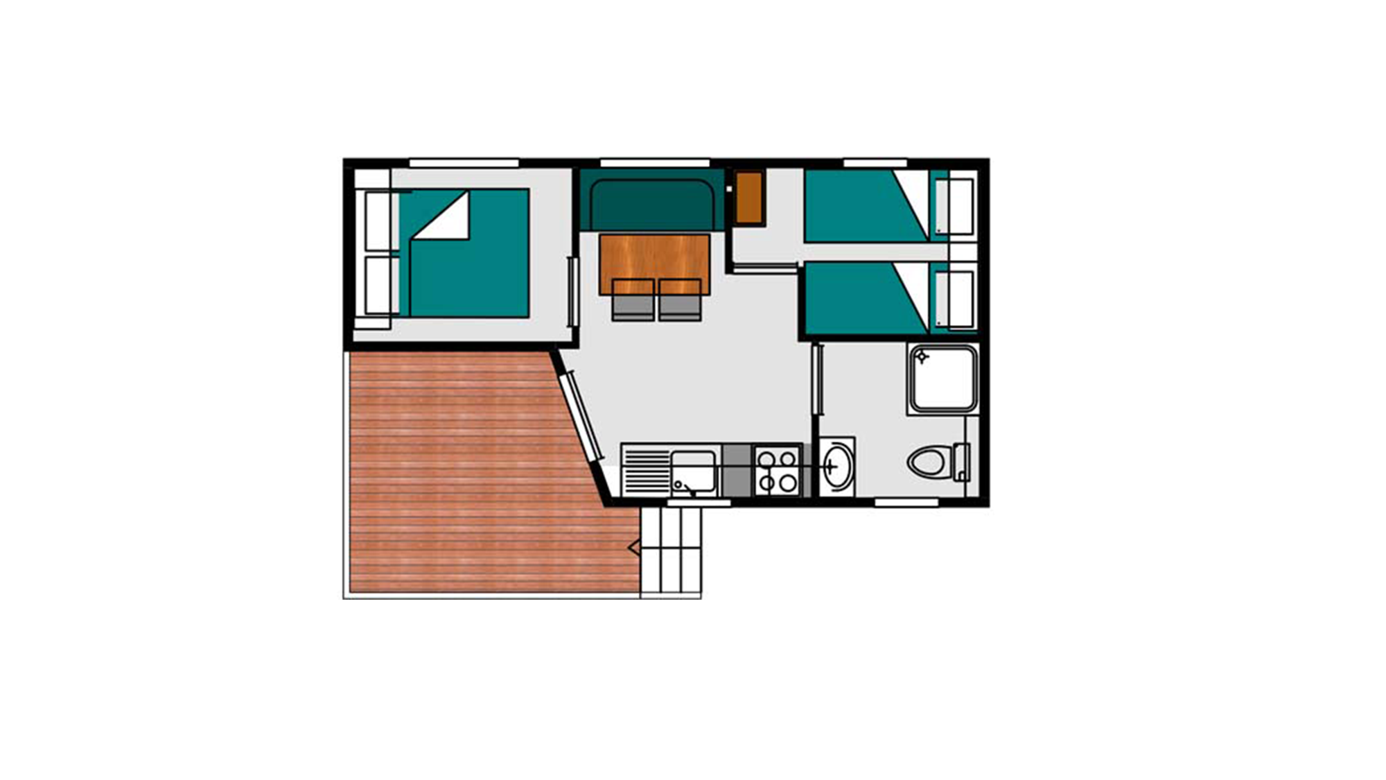 20 m² + 7 m² terrassa coberta, un habitació amb 1 llit doble (160 x 200), un habitació amb 2 llits simples (80 x 190), una racó àpat convertible en llit 2 persones (140 x 190) ; 1 cuina equipada. Una sala de bany amb lavabos, dutxa i WC. Mobles de jardí.